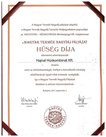 2013 szeptemberében elnyertünk két Magyar Termék Nagydíjat, a Hajnal Párizsi és a Hajnal Dán szalámi termékünkkel. Boltjainkban folyamatosan tájékoztatjuk vevőinket minőségi termékeinkről és elnyert díjazásunkról.