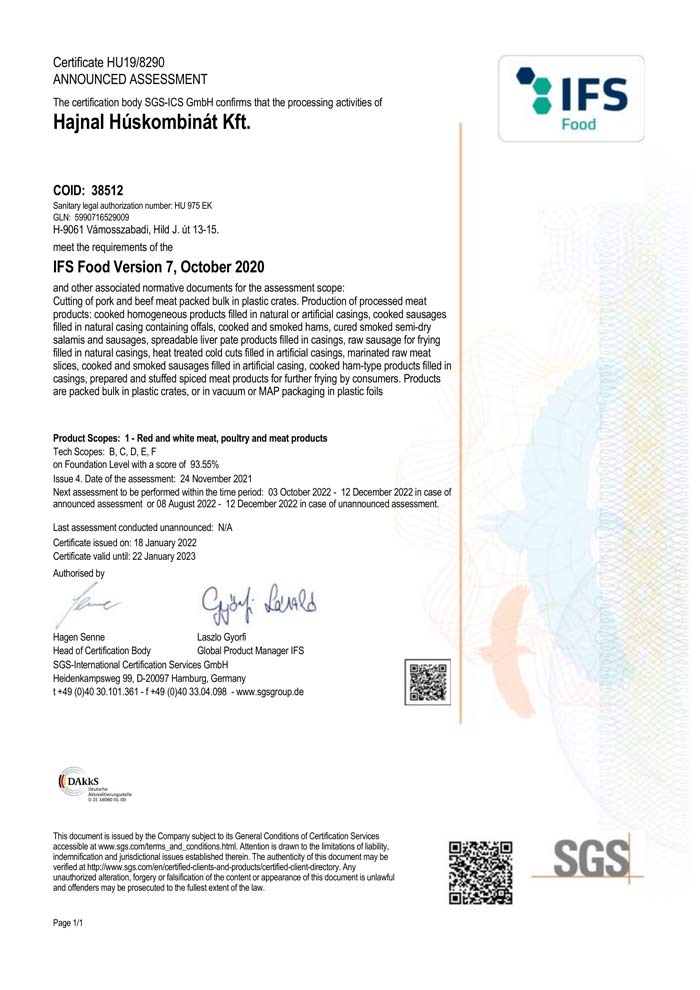 Üzemünk 2009 óta HACCP élelmiszer biztonsági rendszer szerint működik. A később tanúsított IFS FOOD / regisztrációs szám 01 181 00271/ a termék biztonság és a visszaazonosítás legérzékenyebb biztonsági rendszere
